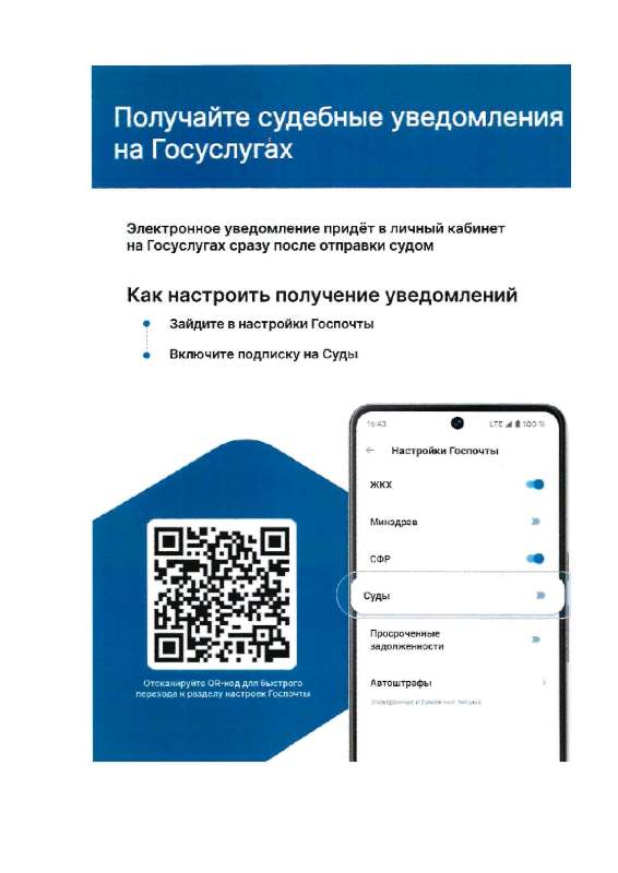 На Портале государственных услуг Российской Федерации появилась возможность получения гражданами электронных судебных уведомлений. Для быстрого перехода к разделу настроек Госпочты можно воспользоваться QR-кодом, отсканировав его и далее настроить получение уведомлений. ![]() |